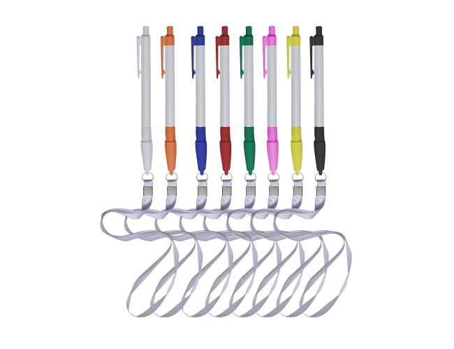 Descrição: Caneta plástica com carga esferográfica azul e acionamento por clique. Acompanha cordão de poliéster com tampa para encaixe da caneta.