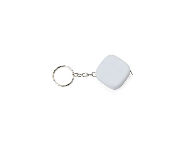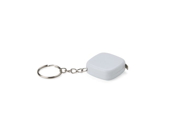 Descrição: Chaveiro trena em plástico com argola metálica e fita de aço para medição, com alcance de até 1 metro e marcações em pés e polegadas.