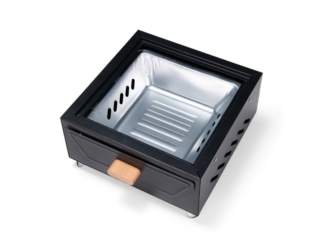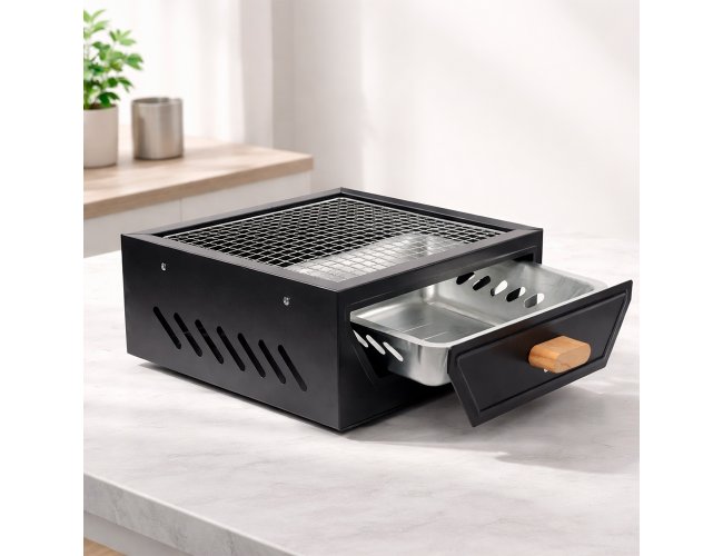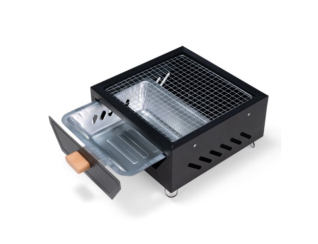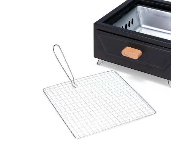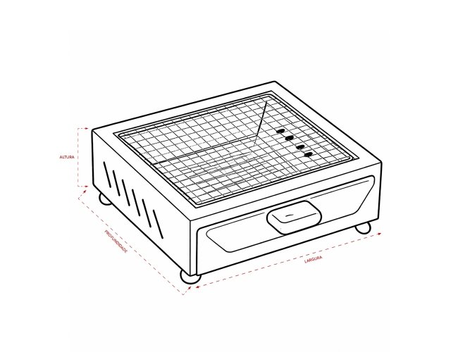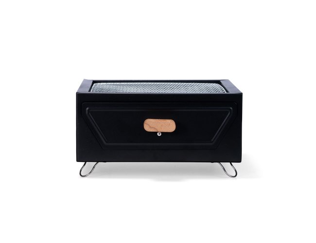 Descrição: Churrasqueira portátil em ferro com pés retráteis em metal. Conta com grelha e bandeja para carvão em metal com puxador de madeira.
