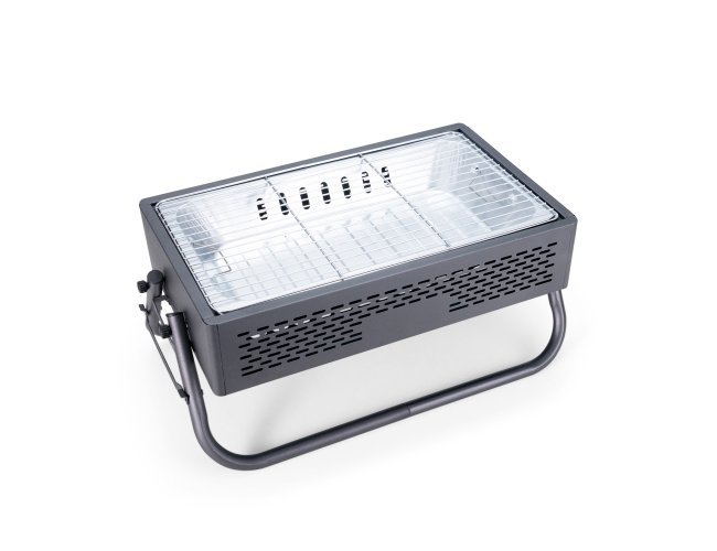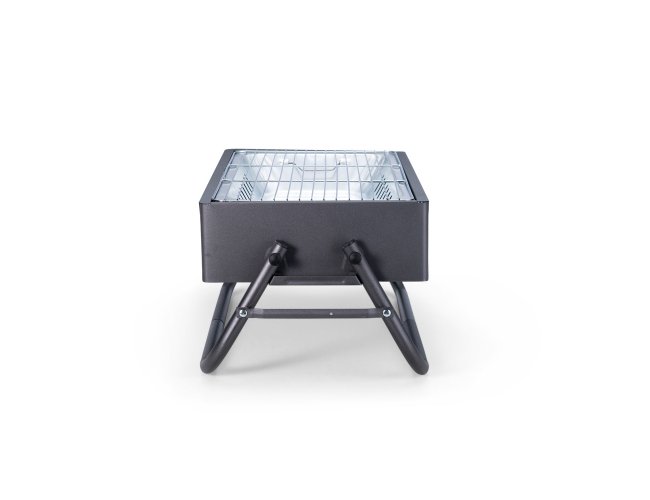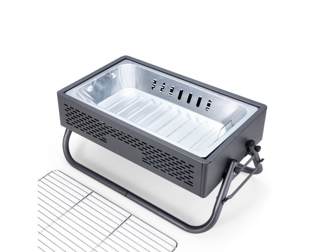 Descrição: Churrasqueira em ferro com aberturas para ventilação e pés montáveis, que também podem ser utilizados como alças para transporte quando a churrasqueira não estiver em uso. Conta ainda com grelha em metal galvanizado e bandeja metálica com alças removíveis para acomodação do carvão.