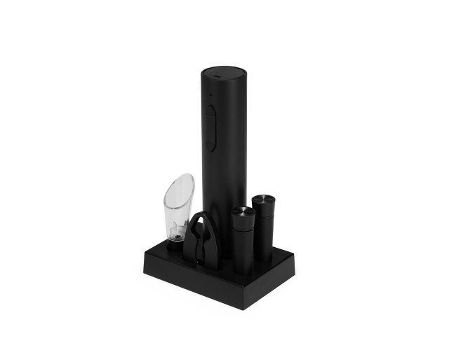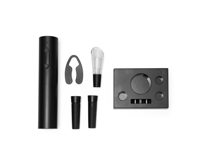 Descrição: Kit vinho com seis peças, incluindo saca-rolhas recarregável com acionamento por botões, bico dosador, duas rolhas plásticas, cortador de lacre e base organizadora. Acompanha cabo USB-C.