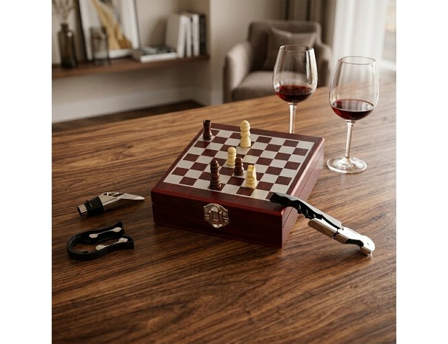 Descrição: Kit vinho composto por 4 itens: saca-rolhas de dois estágios em inox 201, corta-lacre em ABS e inox, bico dosador em liga de zinco com revestimento em silicone e anel corta-gotas (wine collar) em liga de zinco e feltro. O conjunto é acondicionado em um estojo feito em MDF, com revestimento interno em espuma de EVA, dobradiças e trava frontal em metal. Possui acabamento em formato de tabuleiro de xadrez na tampa, acompanhado de 32 peças confeccionadas em bambu.