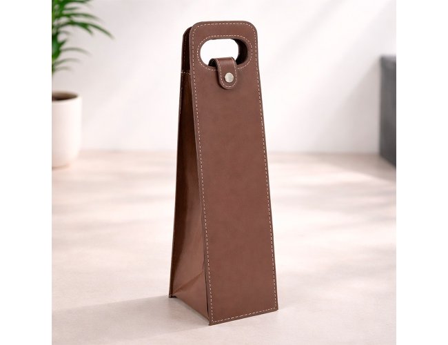 Descrição: Porta-vinho confeccionado em couro sintético e estrutura interna em papelão. Possui alça de mão vazada e fechamento em botão metálico.