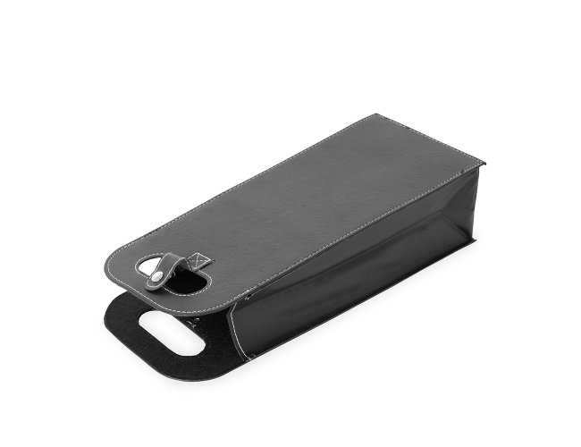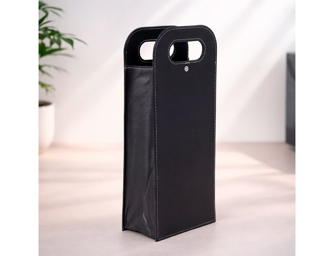 Descrição: Porta-vinhos duplo em couro sintético com estrutura interna em papelão. Possui alça de mão vazada, fechamento em botão metálico e divisória removível em papelão.