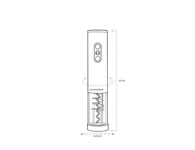 Descrição: Saca-rolhas elétrico com estrutura em ABS, policarbonato, alumínio e inox, além de painel com iluminação em LED e botões emborrachados. Funciona com quatro pilhas AA (não inclusas) e acompanha cortador de lacre.